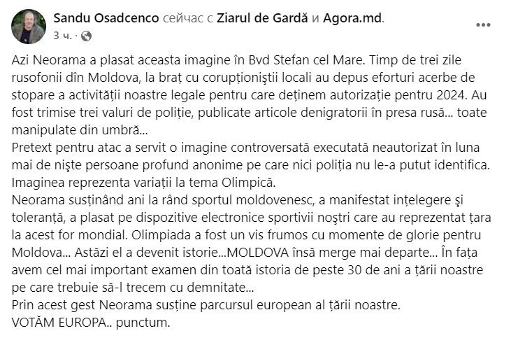 În față avem cel mai important examen din toată istoria de peste 30 de ani a țării noastre pe care trebuie să-l trecem cu demnitate...”, a scris Alexandru Osadcenco pe pagina sa de Facebook.