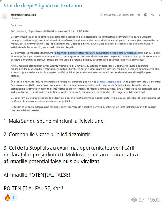 „Vă informăm că redacția Stopfals.md a examinat oportunitatea verificării declarațiilor președintei R. Moldova, Maia Sandu, la care vă referiți, încă pe data de 6 februarie 2026, dar a ajuns la concluzia că dezmințirile companiilor vizate au fost publicate operativ de către o mulțime de instituții media pe site-uri și pe rețelele sociale, iar afirmațiile potențial false nu s-au viralizat.