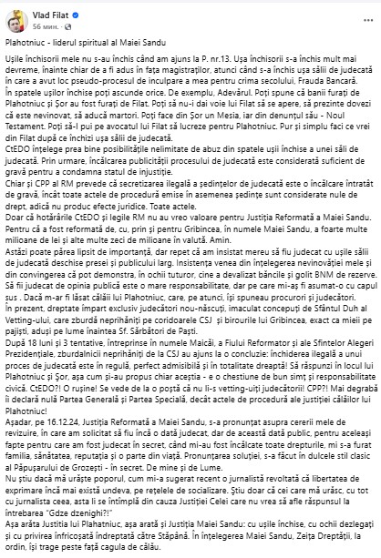 Așadar, pe 16.12.24, Justiția Reformatǎ a Maiei Sandu, s-a pronunțat asupra cererii mele de revizuire, în care am solicitat sǎ fiu încǎ o datǎ judecat, dar de aceastǎ datǎ public, pentru aceleași fapte pentru care am fost judecat în secret, când mi-au fost încǎlcate toate drepturile, mi s-a furat familia, sǎnǎtatea, reputația și o parte din viațǎ. Pronunțarea soluției s-a fǎcut în dulcele stil clasic al Pǎpușarului de Grozești - în secret. De mine și de Lume.