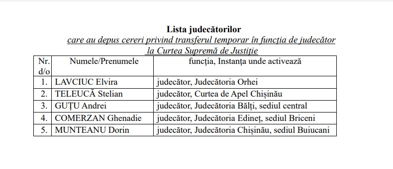 Așadar, în cadrul ședinței de astăzi a CSM, a fost examinată cererea de desfășurare a concursului privind suplinirea, prin transfer temporar, a funcțiilor vacante de judecător la Curtea Supremă de Justiție.
