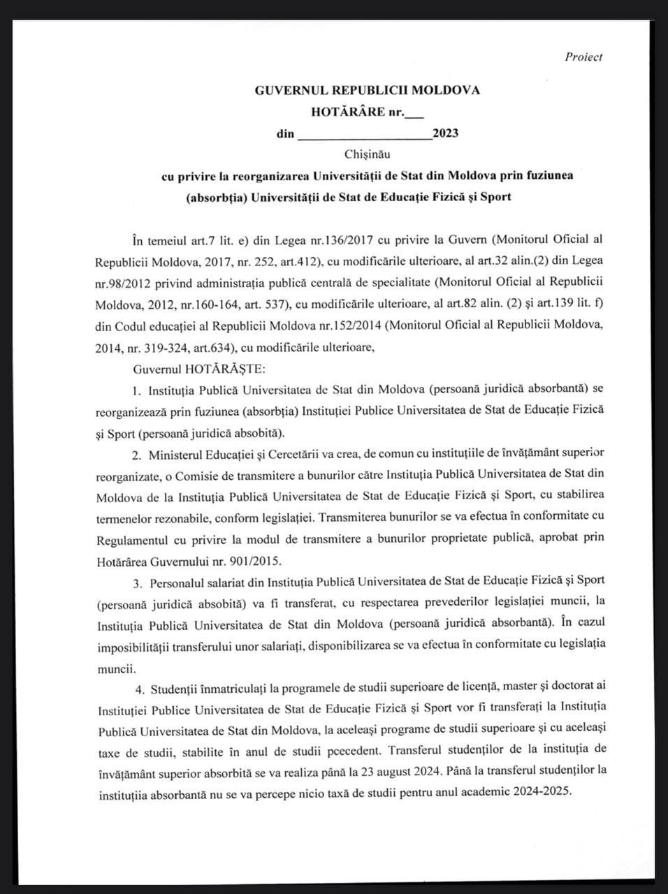 Ministerul Educației și Cercetării a elaborat proiectul reorganizării Universității de Educație Fizică și Sport. Acesta prevede absorbția instituției de către Universitatea de Stat din Moldova.