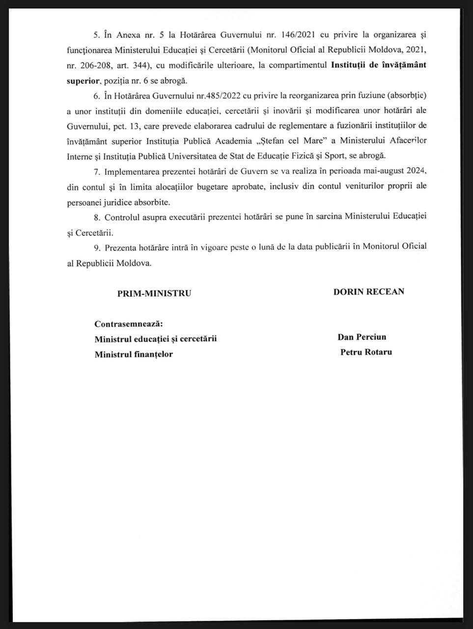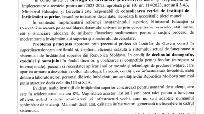 „În conformitate cu Strategia de dezvoltare „EDUCAȚIA 2030” și programului de implementare a acestuia pentru anii 2023-2025, Ministerul Educației și Cercetării este responsabil de consolidarea rețelei de instituții de învățământ superior, bazată pe indicatori de calitate, racordată la necesitățile pieței muncii.