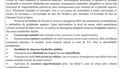 Problema principală abordată prin prezentul proiect de hotărâre de Guvern constă în supradimensionarea artificială și, implicit, eficiența scăzută a sistemului actual de funcționare a sistemului de învățământ superior din Republica Moldova, în condițiile declinului demografic, exodului și șomajului în rândul tinerilor, globalizarea și competiția pentru fonduri, precum și necesitatea aplicării noilor metode și tehnologii predare-învățare, care apar ca urmare a dezvoltării noilor tehnologii”, scrie în nota informativă a proiectului.