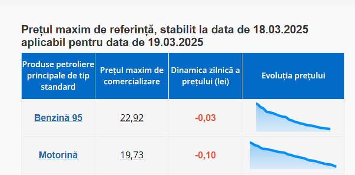 Agenția Națională pentru Reglementare în Energetică anunță pentru mâine, 19 martie, prețuri mai mici la carburanți. Astfel, pentru un litru de benzină șoferii vor plăti cu trei bănuți mai puțin, iar pentru cel de motorină - cu 10 bani.