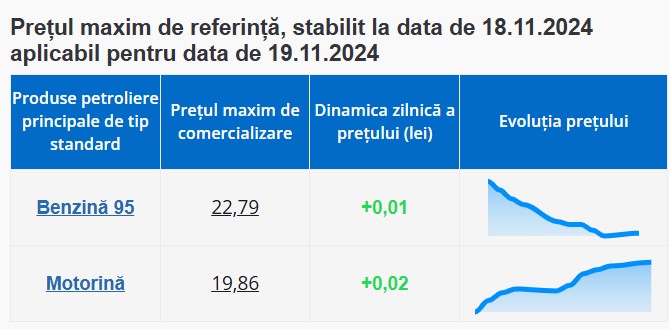 Prin urmare, mâine, 19 noiembrie, vom avea următoarele prețuri maximale de comercializare cu amănuntul a produselor petroliere principale de tip standard: