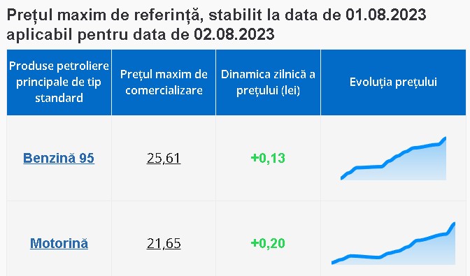 Prin urmare, pentru mâine, 3 august, prețurile maximale de comercializare cu amănuntul a produselor petroliere principale de tip standard sunt stabilite la nivelul de: