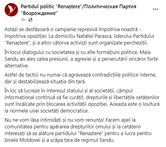 Nu ne vom lăsa intimidați și nu vom renunța. Facem apel la comunitatea pentru apărarea drepturilor omului și la cetățenii interesați să se alăture partidului „Renaștere" pentru a lucra pentru binele Moldovei și a scăpa țara de regimul Sandu”, se arată într-un comunicat al Partidului Renaștere.