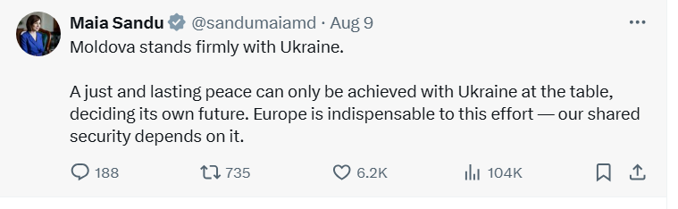 Președinta Republicii Moldova a transmis un mesaj de susținere înaintea summitului Trump-Putin. „Moldova susține ferm Ucraina. O pace justă și durabilă poate fi realizată doar cu Ucraina la masă, care își decide propriul viitor”, a scris Maia Sandu.