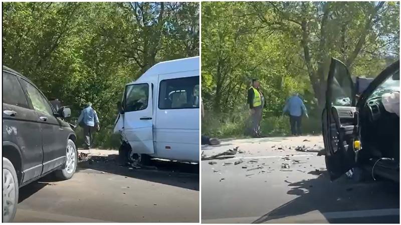 În imaginile video se observă de aproape urmările accidentului grav. Microbuzul și Honda care s-au lovit frontal sunt distruse, iar un bărbat zace la sol și dă din mână.