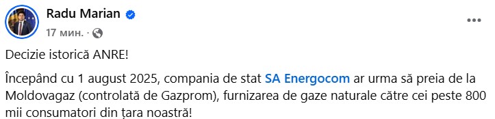 „Decizie istorică ANRE! Începând cu 1 august 2025, compania de stat SA Energocom ar urma să preia de la Moldovagaz (controlată de Gazprom), furnizarea de gaze naturale către cei peste 800 mii consumatori din țara noastră”, a scris Radu Marian.
