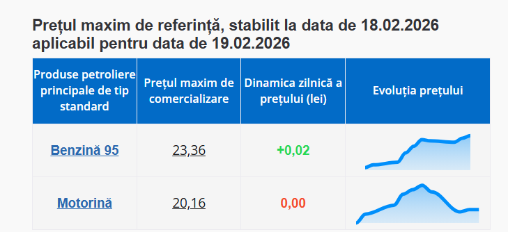 Agenția Națională pentru Reglementare în Energetică (ANRE) a stabilit noile prețuri maximale de referință pentru carburanți, valabile pentru mâine, 19 februarie 2026.