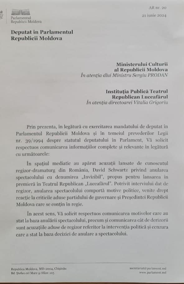 Astăzi, aduc în atenția dumneavoastră un subiect sensibil și important pentru cultura și libertatea de expresie din Republica Moldova. Într-un interviu recent, cunoscutul regizor și dramaturg român David Schwartz a dezvăluit detalii despre anularea spectacolului „Invizibil” la Teatrul Republican „Luceafărul”. Potrivit acestuia, motivele anulării ar fi de natură politică, după ce reprezentanții puterii au descoperit în piesă, critici aduse partidului de guvernare și Președintei Republicii Moldova, Maia Sandu.