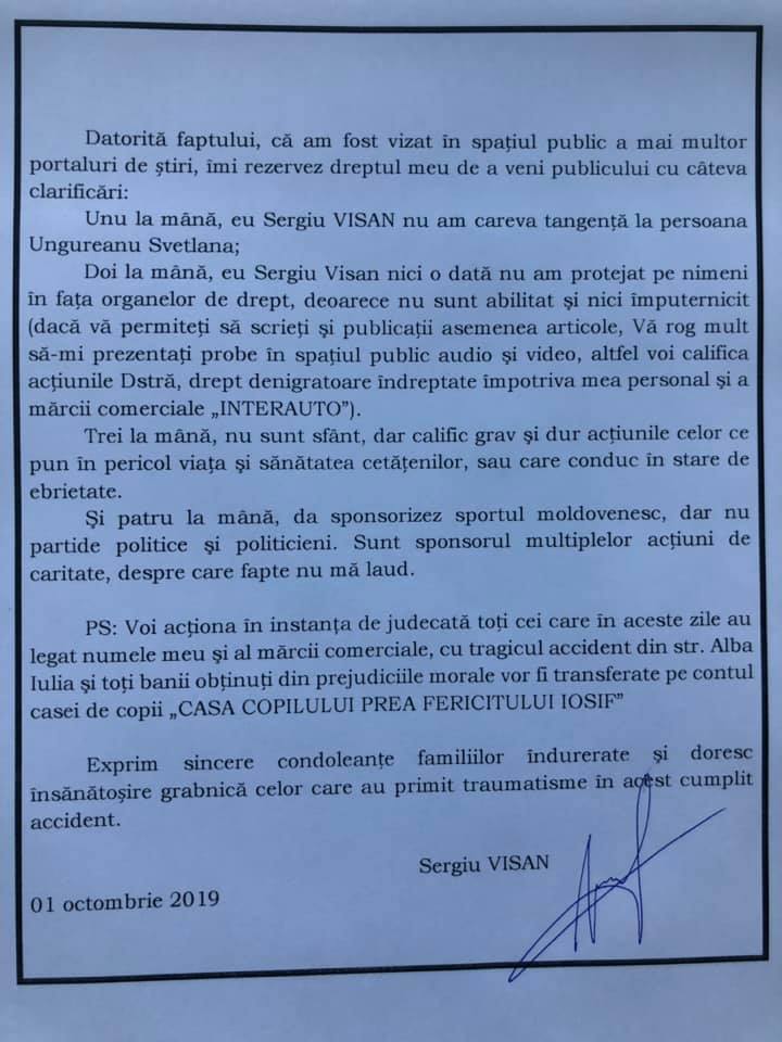 De asemenea, Sergiu Visan a ținut să califice dur acțiunile celor care pun în pericol viața cetățenilor și urcă în stare de ebrietate la volan și anunță că îi va da în judecată pe toți cei care au legat numele său cu cel al tragicului accident de la Buiucani.