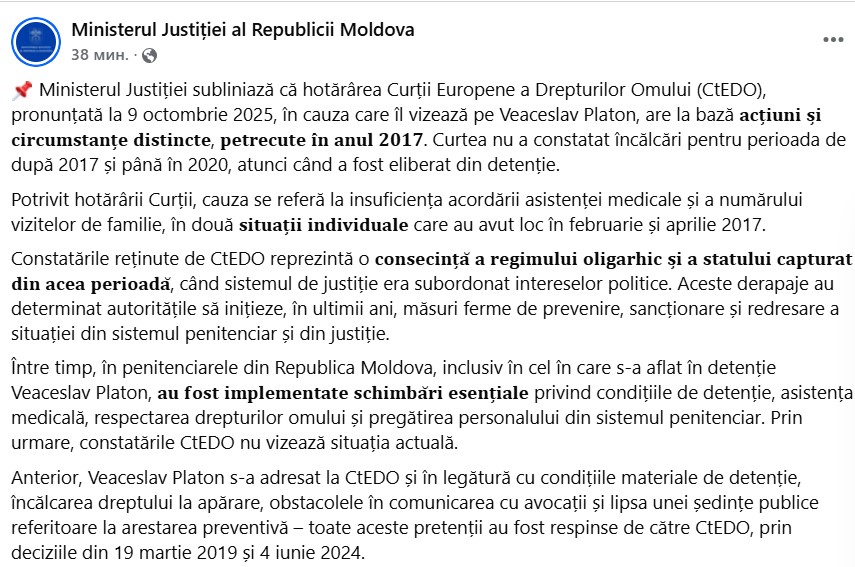 Anterior, Veaceslav Platon s-a adresat CtEDO și în legătură cu condițiile materiale de detenție, încălcarea dreptului la apărare, obstacolele în comunicarea cu avocații și lipsa unei ședințe publice referitoare la arestarea preventivă – toate aceste pretenții au fost respinse de către CtEDO, prin deciziile din 19 martie 2019 și 4 iunie 2024”, notează MJ.