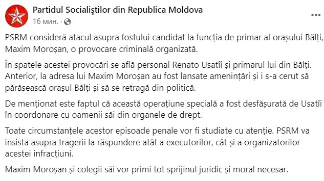 „PSRM consideră atacul asupra fostului candidat la funcția de primar al orașului Bălți, Maxim Moroșan, o provocare criminală organizată.