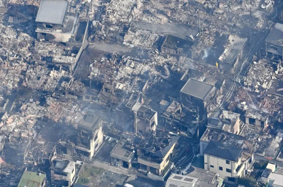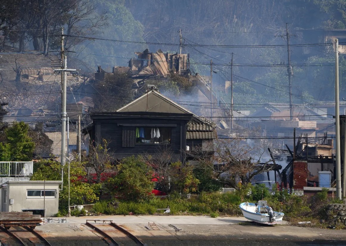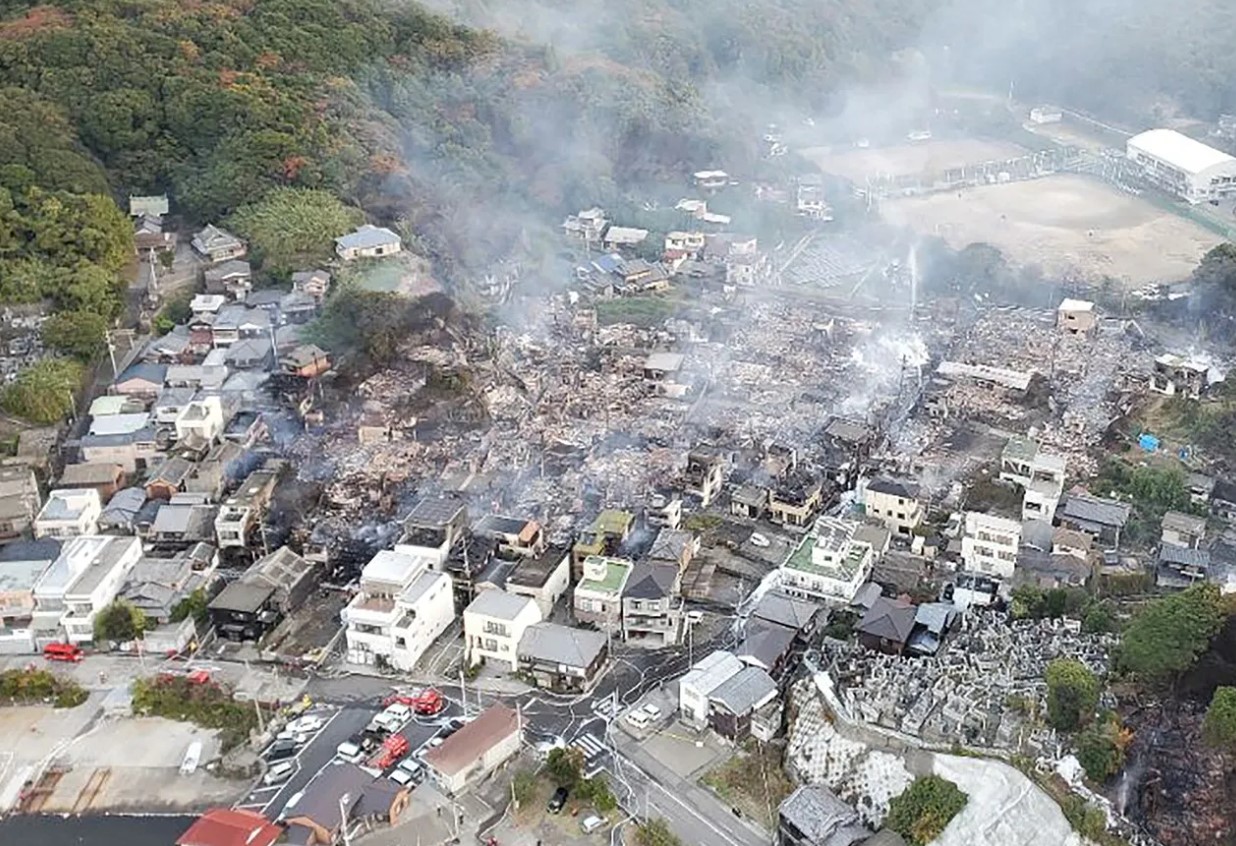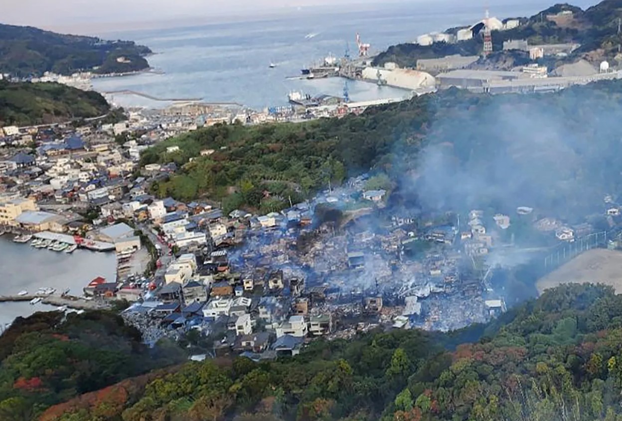 Imaginile aeriene difuzate de posturile de televiziune au arătat case transformate în ruine şi coloane groase de fum ridicându-se din cartierul Saganoseki al oraşului Oita, situat pe un deal, unde un incendiu a izbucnit marți seară, potrivit Reuters și AP.