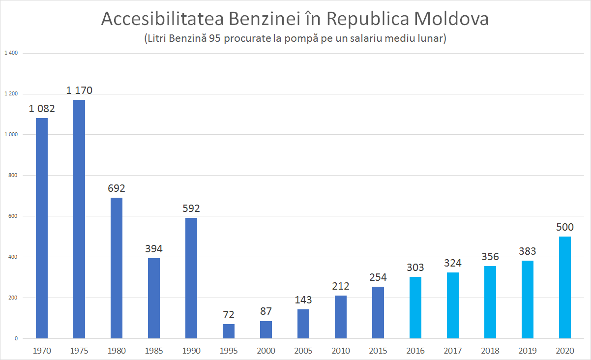 Putem afirma cu o ușoară doză de umor că, Benzina în 2020 a devenit pentru prima dată mai accesibilă pentru moldoveni, decât în perioada socialismului avansat de până la începutul crizei din 1987-1993. Perioada de până la 1980 nu este relevantă, deoarece atunci nu erau mașini, nu era consum, iar prețul era unul artificial și putea fi menținut ușor în lipsă de consum”, conchide Ioniță.