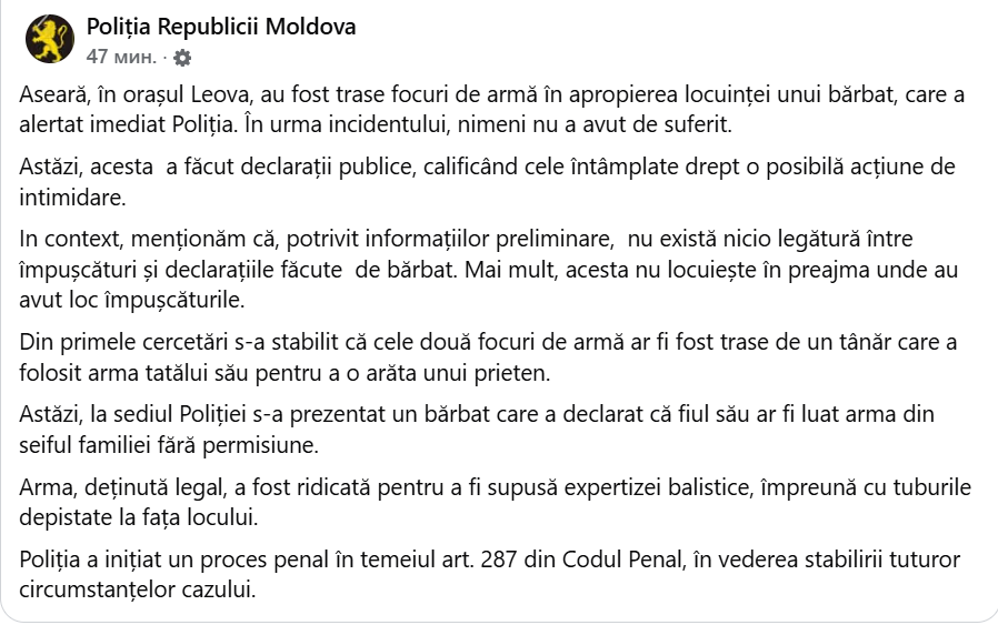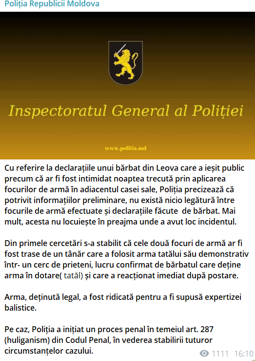 „Cu referire la declarațiile unui bărbat din Leova care a ieșit public precum că ar fi fost intimidat noaptea trecută prin aplicarea focurilor de armă în adiacentul casei sale, Poliția precizează că potrivit informațiilor preliminare, nu există nicio legătură între focurile de armă efectuate și declarațiile făcute de bărbat. Mai mult, acesta nu locuiește în preajma unde a avut loc incidentul.
