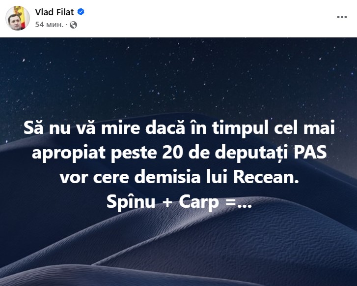 „Să nu vă mire dacă în timpul cel mai apropiat peste 20 de deputați PAS vor cere demisia lui Recean. Spînu + Carp =...”, este mesajul lui Vlad Filat, în contextul reamnierilor guvernamentale care urmează să fie anunțate luni, 18 noiembrie.