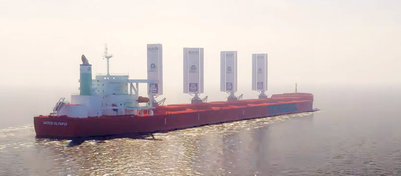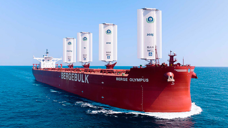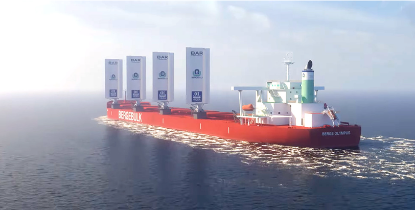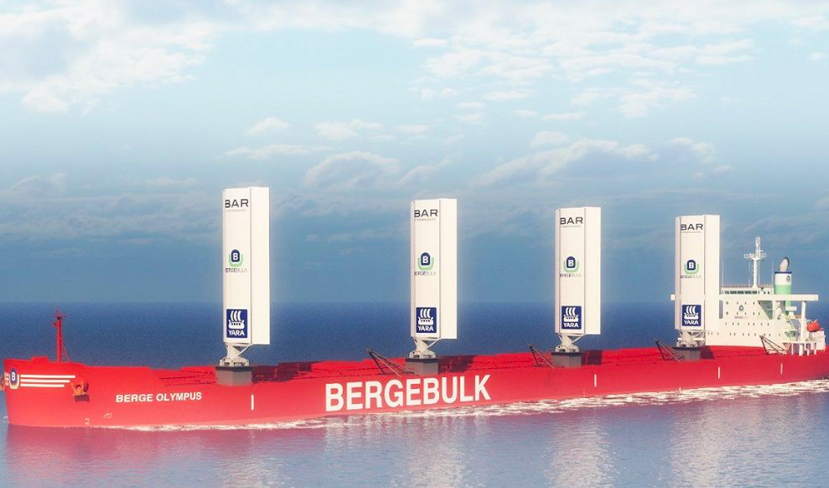 Tocmai această calitate de ajustare a puterii motorului său diesel şi clasa mai modernă de emisii au calificat-o la renovarea prin care a trecut acum, de echipare cu vele aerodinamice. Berge Olympus e o navă cargo de talie mare, măsurând 300 metri lungime şi 49 metri lăţime, iar velele aplicate acum pe ea sunt de cea mai mare suprafaţă, fiind ele cele mai puternice şi, totodată, puse pe cea mai puternică navă cargo din lume, dintre toate care au primit asemenea vele vreodată.