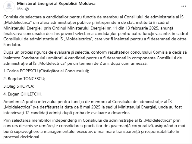 „Astfel, după un proces riguros de evaluare și selecție, conform rezultatelor concursului Comisia a decis să înainteze Fondatorului următorii 4 candidați pentru a fi desemnați în componența Consiliului de administrație al ÎS „Moldelectrica” pe un termen de 2 ani, după cum urmează: