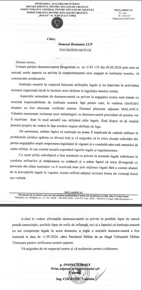 Afirmațiile domnului Malanca sunt complet neadevărate și răuvoitoare. Dumnealui a hărțuit-o constant pe soția mea telefonic și online. (găsiți atașate mesaje doveditoare de pe email și Whatsapp). Gasiti atașat și răspunsul oficial primit de la ISU în legătură cu petiția referitoare la comportamentului domnului Malanca.