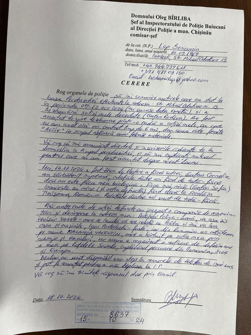 În legătură cu ”percheziția domiciliară” despre care s-a scris, doresc să precizez că atunci când am ajuns la domiciliul din Chisinău, în 13 octombrie, am descoperit că locuința era devastată, iar ușa spartă. După ce am apelat 112 mi s-a comunicat că a avut loc o percheziție a poliției despre care nu fusesem anunțat deoarece nu am nicio calitate în dosar. Gasiti atasata cererea facuta la Politia Chisinău.