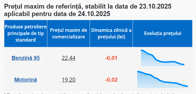 Agenția Națională pentru Reglementare în Energetică (ANRE) a afișat noile prețuri la carburanți, pentru mâine, 24 octombrie. Astfel, benzina va fi mai ieftină cu 1 ban, iar motorina cu 2 bănuți.