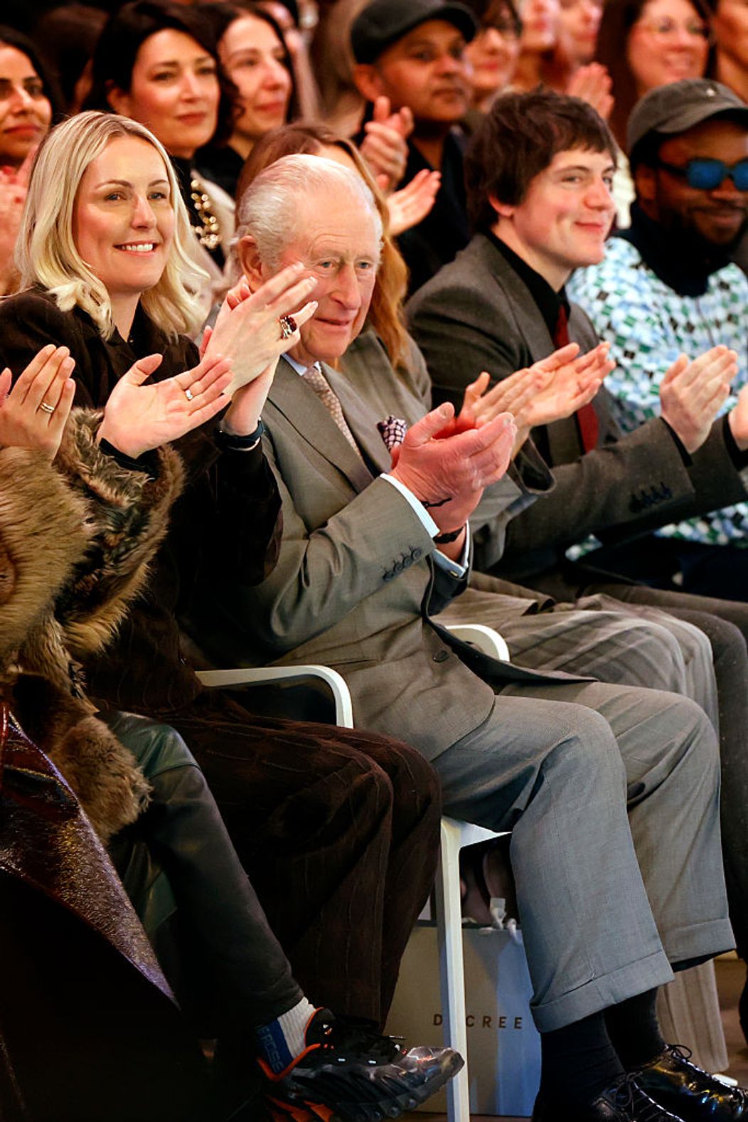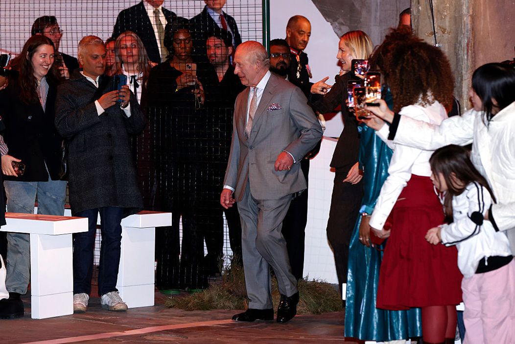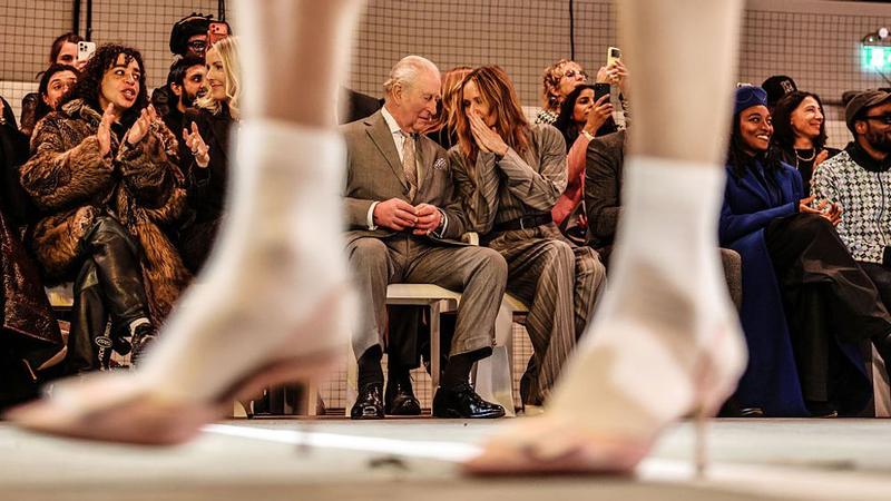 Îmbrăcat într-un costum gri cu un singur rând de nasturi, asortat cu o cămașă albă cu guler, cravată cu imprimeu și pantofi eleganți, Charles a stat lângă vedeta modei britanice Stella McCartney și CEO-ul British Fashion Council, Laura Weir, care l-au escortat pe monarh în locație. Participanții, inclusiv rapperii britanici Skepta și Lil Simz, au fost rugați să se ridice în picioare la sosirea monarhului.