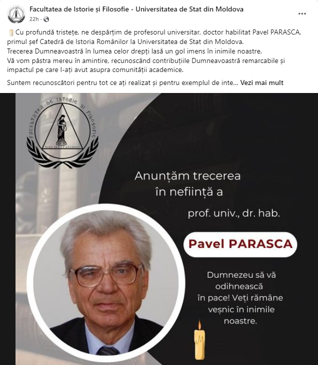 „Cu profundă tristețe, ne despărțim de profesorul universitar, doctor habilitat Pavel Parasca, primul șef Catedră de Istoria Românilor la Universitatea de Stat din Moldova.