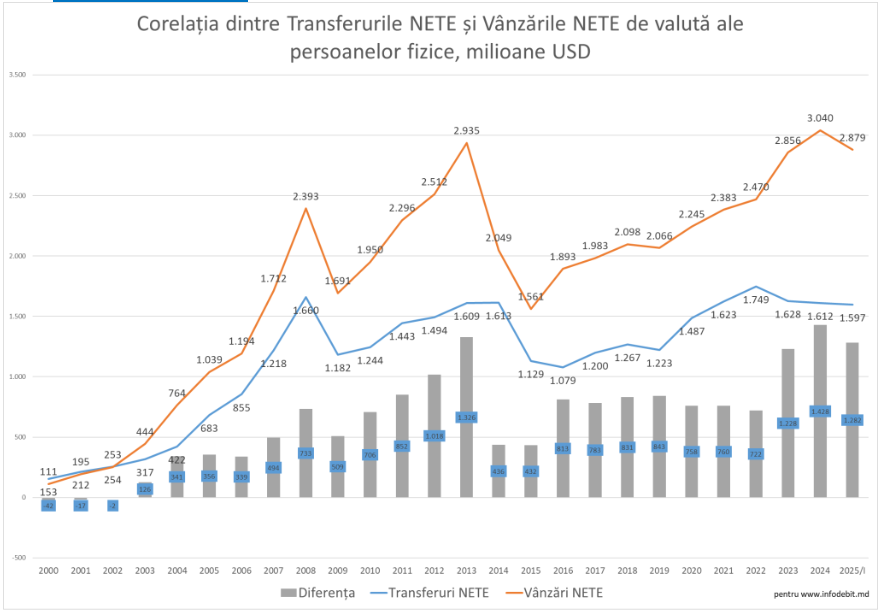 De aceea, analiza reală se face nu doar pe baza transferurilor bancare, ci și a vânzărilor NETE de valută de către persoane fizice.