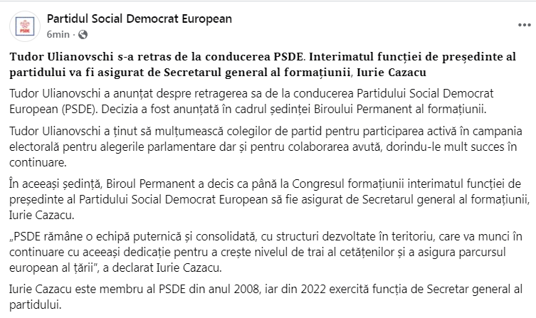 „În aceeași ședință, Biroul Permanent a decis ca până la Congresul formațiunii interimatul funcției de președinte al Partidului Social Democrat European să fie asigurat de Secretarul general al formațiunii, Iurie Cazacu.