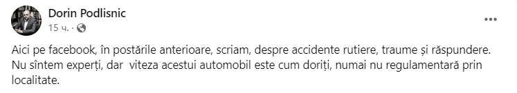 „Nu suntem experți, dar viteza acestui automobil este cum doriți, numai nu regulamentară printr-o localitate”, a scris avocatul Dorin Podlisnic.