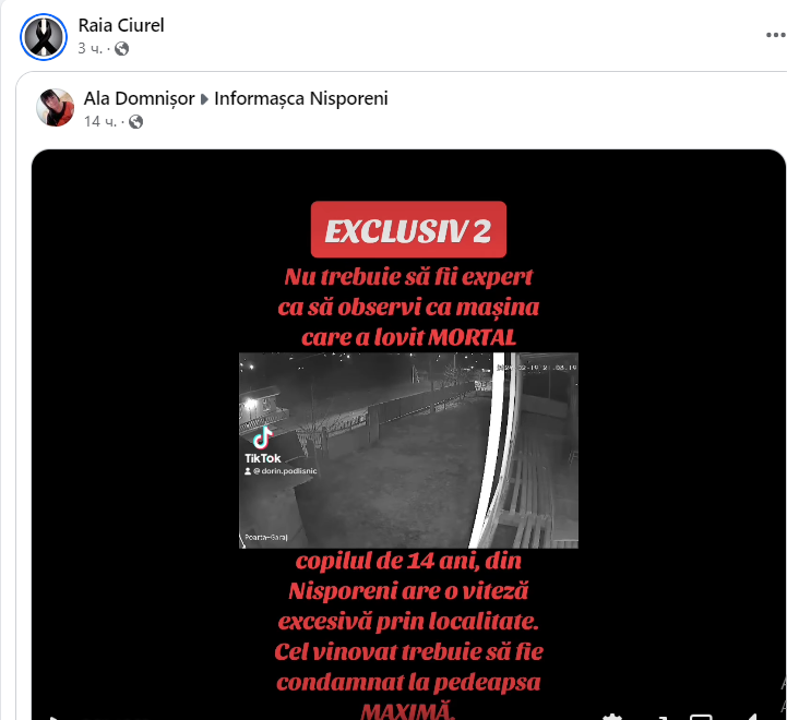 Raisa Ciurel, mama lui Mihai, băiatul ucis de o mașină la intrarea în satul Boldurești, a distribuit secvența video publicată de avocat, pe pagina sa de Facebook.