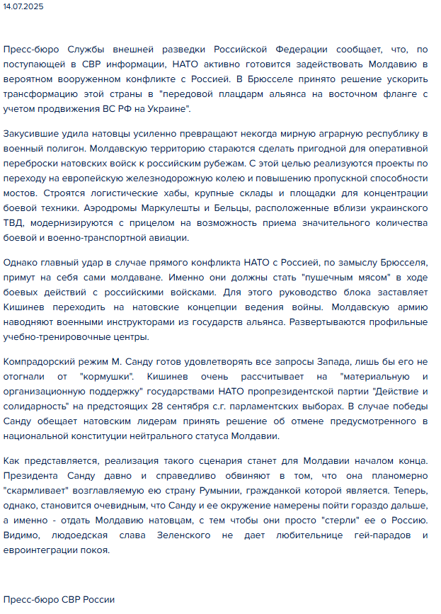 „Oficialii NATO, care au „scăpat de sub control”, transformă intens fosta republică agrară pașnică într-un poligon militar. Se încearcă adaptarea teritoriului moldovenesc pentru a permite transferul rapid al trupelor NATO către granițele Rusiei. În acest scop, sunt implementate proiecte de trecere la ecartamentul feroviar european și de consolidare a capacității de rezistență a podurilor.