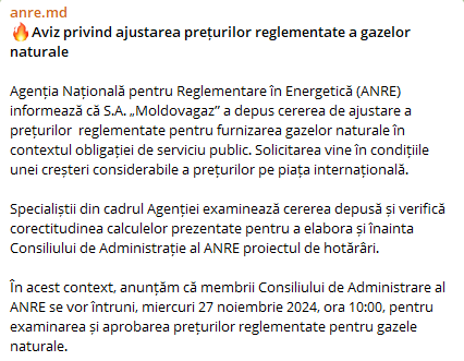 În acest context, anunțăm că membrii Consiliului de Administrare al ANRE se vor întruni, miercuri 27 noiembrie 2024, ora 10:00, pentru examinarea și aprobarea prețurilor reglementate pentru gazele naturale”, menționează ANRE.