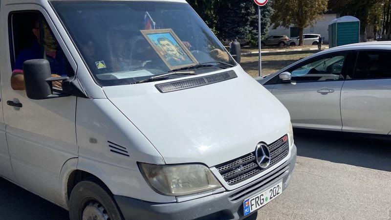 Poza zilei: Un maxi taxi cu portretul lui Stalin și steagul Rusiei circulă prin Bălți, la 32 de ani de Independență
