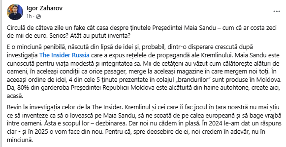 Revin la investigația celor de la The Insider. Kremlinul și cei care îi fac jocul în țara noastră nu mai știu ce să inventeze ca să o lovească pe Maia Sandu, să ne scoată de pe calea europeană și să bage vrajbă între oameni. Ăsta e scopul lor – dezbinarea. Dar noi nu cădem în plasă. În 2024 le-am dat un răspuns clar - și în 2025 o vom face din nou. Pentru că, spre deosebire de ei, noi credem în adevăr, nu în minciună”, a scris pe rețele Zaharov.