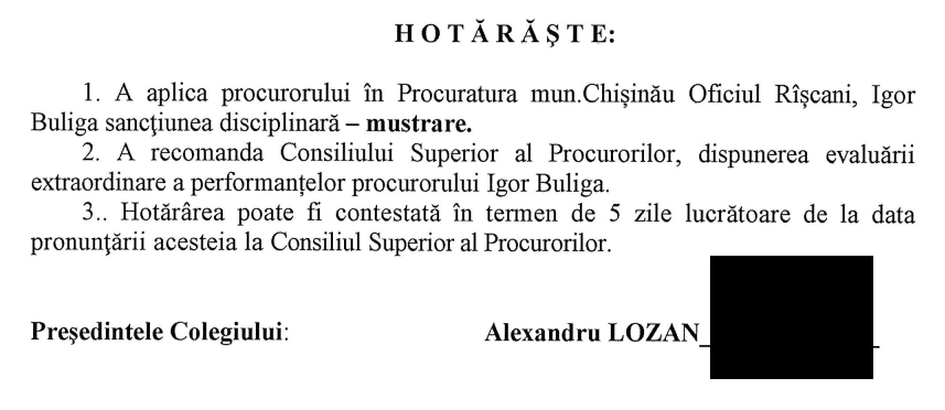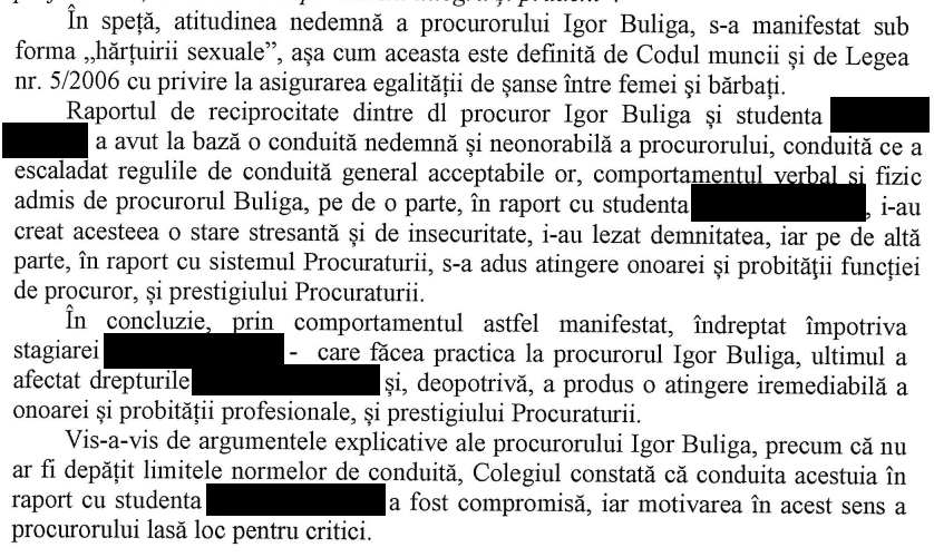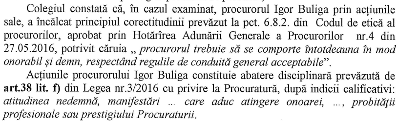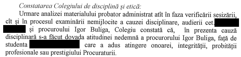 Potrivit deciziei Colegiului, procurorul Igor Buliga, în raport cu o studentă aflată în practică profesională la Procuratura municipiului Chișinău, Oficiul Rîșcani, a manifestat o atitudine nedemnă, comportamente verbale și fizice inadecvate, încălcând grav standardele de conduită profesională și principiile eticii procurorului. Colegiul a aplicat sancțiunea disciplinară de mustrare și a recomandat evaluarea extraordinară a performanțelor acestuia.