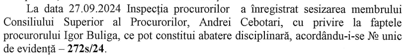 Procurorul Igor Buliga nu a fost de găsit, deocamdată, pentru a oferi o reacție la sancțiunea pe care a primit-o.