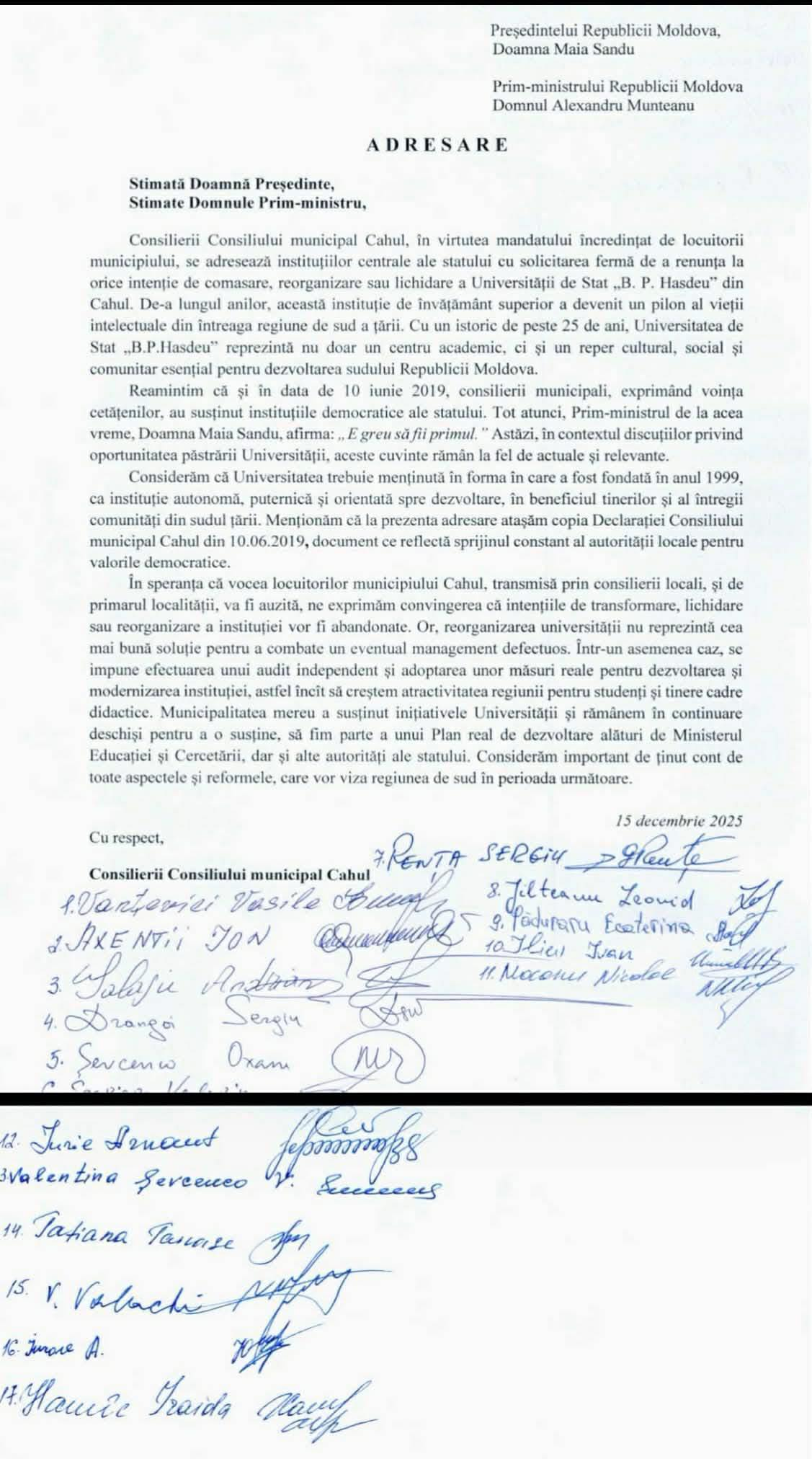 Consilierii municipali din Cahul cer președintei Maia Sandu și premierului Alexandru Munteanu să renunțe la planurile de reorganizare a Universității de Stat „B.P. Hasdeu”, chiar în contextul în care numărul studenților crește constant, ajungând la 1025 în 2025. În adresarea oficială, aleșii locali subliniază că instituția, cu un istoric de peste 25 de ani, reprezintă un pilon al vieții intelectuale și culturale din sudul țării și că reorganizarea nu reprezintă o soluție potrivită pentru dezvoltarea acesteia.