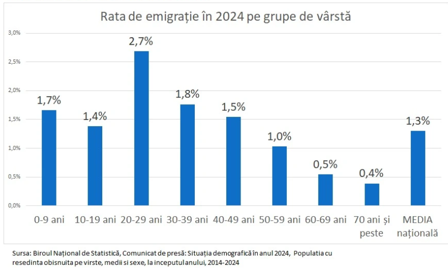 Tinerii pleacă primii: Rata de emigrare este cea mai mare la grupa de vârstă 20–29 ani: 2,7% în 2024. Aceasta este exact forța activă care ar trebui să susțină economia.
