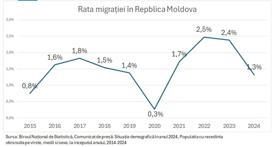 Migrația pe valuri: După vârful istoric din 2022-2023 (2,5%), rata emigrației s-a temperat la 1,3% în 2024, dar acest lucru se datorează și faptului că… nu mai are cine pleca.