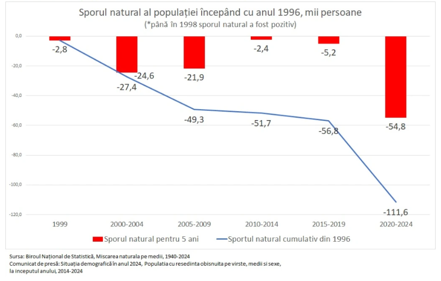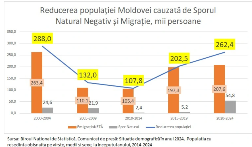 - Sporul natural negativ: Diferența dintre nașteri și decese a fost de -9.000 în 2024. ➤ În ultimii 5 ani: -55.000 persoane – o pierdere similară cu dispariția completă a unui raion.