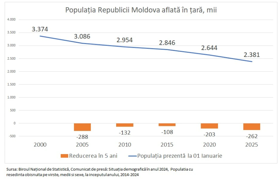 - Începând cu anul 2000, populația Moldovei aflată efectiv în țară a scăzut de la 3,37 milioane la 2,38 milioane. ➤ O pierdere de aproape 1 milion de persoane – 1 din 3 cetățeni.