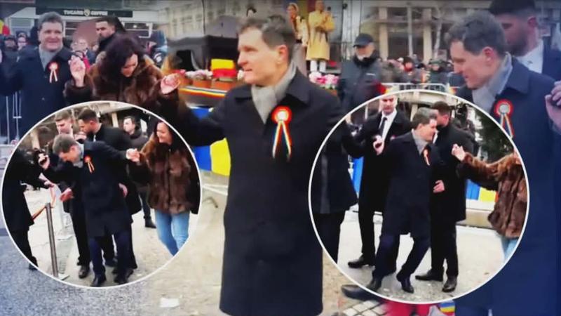 În momentul filmat la Iași, președintele se împiedică de decor, apoi de SPP-iști. Nestingherit, își continuă momentul, alături de ceilalți participanți la horă, în timp ce pe fundal se aud voci: „Așa, domn președinte!”.