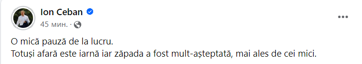 „Totuși afară este iarnă iar zăpada a fost mult-așteptată, mai ales de cei mici”, a scris Ion Ceban pe pagina sa de Facebook.