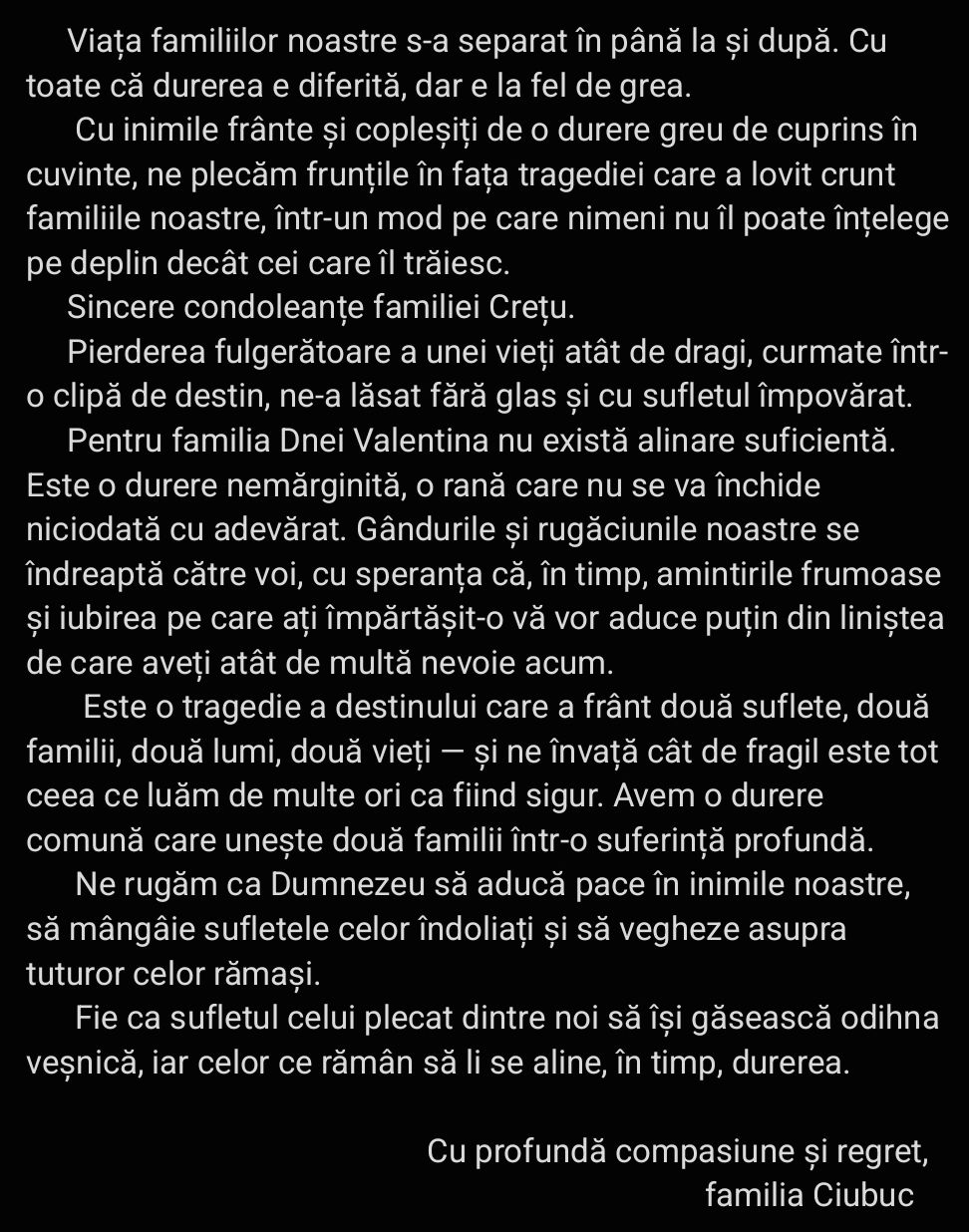 „Viața familiilor noastre s-a separat în până la și după. Cu toate că durerea noastră e diferită, dar e la fel de grea. Cu inimile frânte și copleșiți de o durere greu de cuprins în cuvinte, ne plecăm frunțile în fața tragediei care a lovit crunt familiile noastre, într-un mod pe care nimeni nu îl poate înțelege pe deplin decât cei care îl trăiesc”, se menționează în mesajul de condoleanțe al rudelor șoferului de troleibuz implicat, adresat familiei femeii decedate.