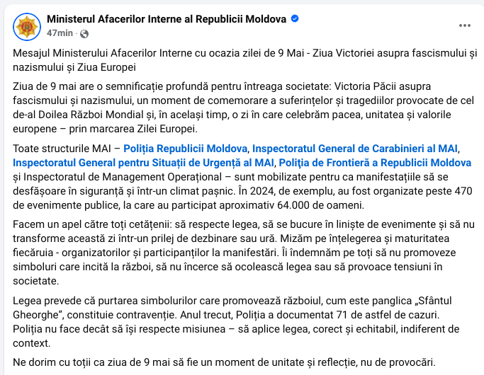 Facem un apel către toți cetățenii: să respecte legea, să se bucure în liniște de evenimente și să nu transforme această zi într-un prilej de dezbinare sau ură. Mizăm pe înțelegerea și maturitatea fiecăruia - organizatorilor și participanților la manifestări. Îi îndemnăm pe toți să nu promoveze simboluri care incită la război, să nu încerce să ocolească legea sau să provoace tensiuni în societate.