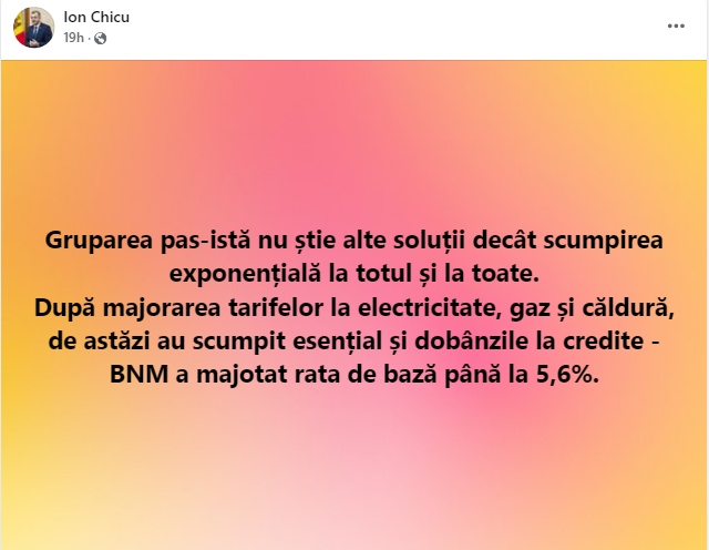 După majorarea tarifelor la electricitate, gaz și căldură, au scumpit esențial și dobânzile la credite - BNM a majotat rata de bază până la 5,6%”, a scris Chicu.